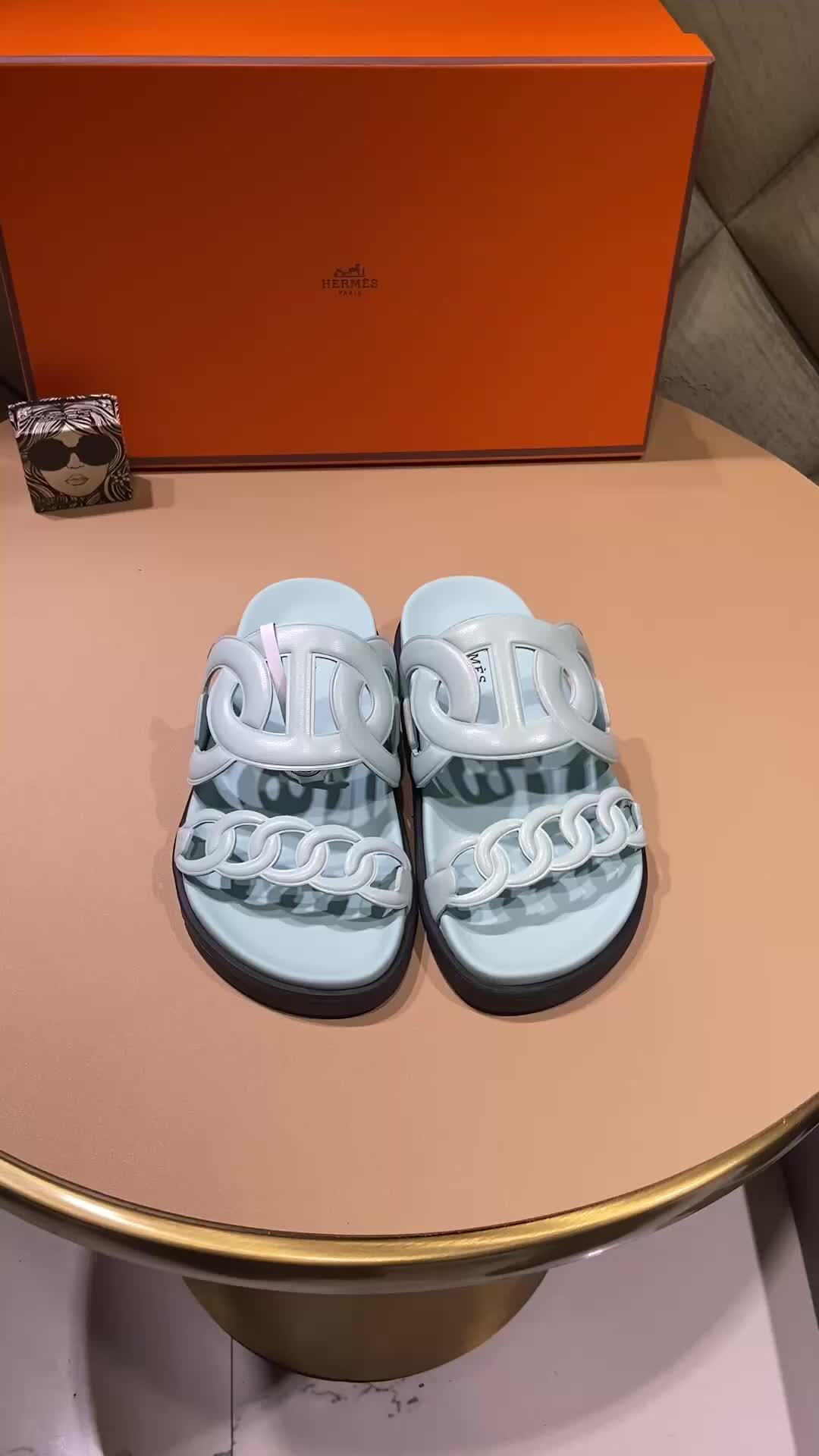 Herme*💖23ss春夏新款进口小牛皮纯色猪鼻子链条休闲拖鞋天蓝色